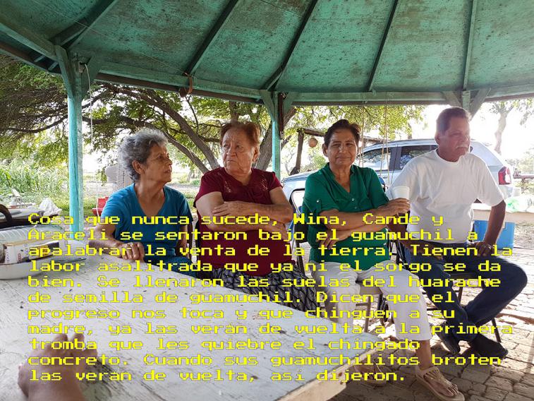 For this project, my aunt Cande tells about an imagined gesture of unintended resistance: walking around passing gossip and purposely spreading seeds of trees that will break the concrete of the growing nearby city of Matamoros.